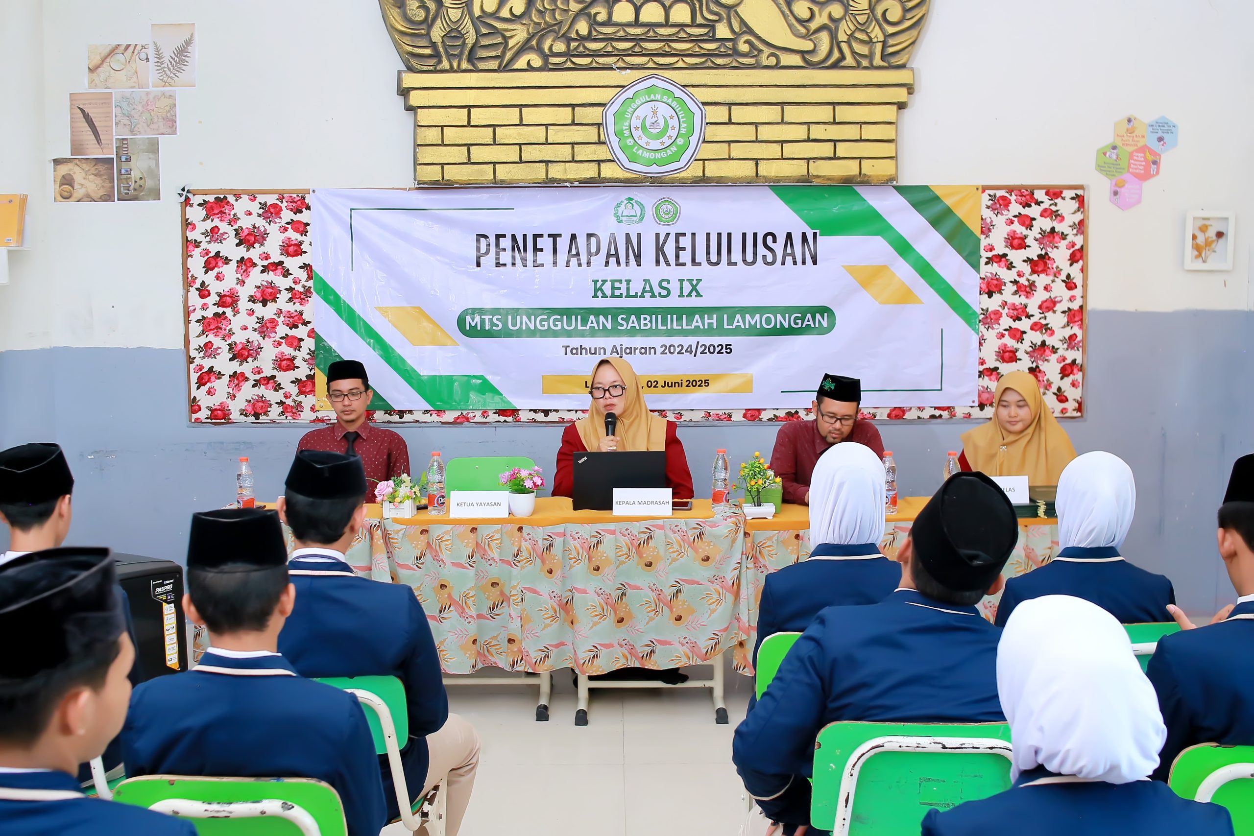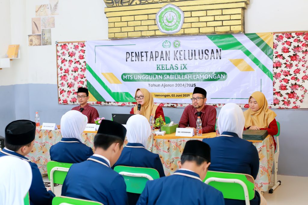 Lamongan, 2 Juni 2025 – MTs Unggulan Sabilillah Lamongan resmi menetapkan kelulusan siswa kelas IX Tahun Ajaran 2024/2025 melalui rapat pleno kelulusan yang digelar pada Senin pagi di ruang pertemuan madrasah. Kegiatan ini menjadi momen penting sebagai penutup dari proses pendidikan selama tiga tahun yang telah dilalui para siswa.