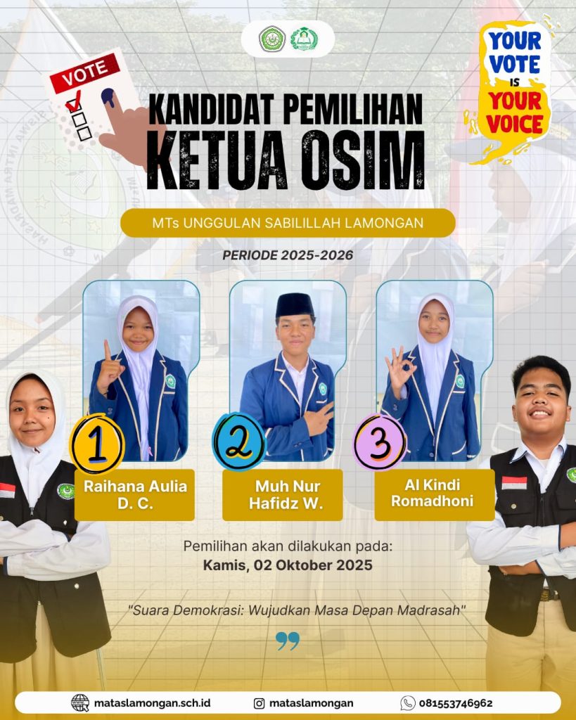 Lamongan (2/10) – MTs Unggulan Sabilillah (MATAS) Lamongan kembali menyelenggarakan pesta demokrasi untuk memilih Ketua Organisasi Siswa MTs Unggulan Sabilillah (OSMATAS) periode 2025/2026. Kegiatan yang berlangsung pada Kamis (2/10/2025), diikuti dengan penuh antusias oleh seluruh siswa sebagai wujud pembelajaran demokrasi sejak dini.